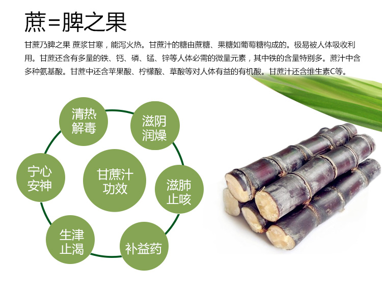 蔗產(chǎn)地在我國分布較廣,甘蔗多汁、含有糖、蛋白質(zhì)、脂肪、鈣、磷、鐵及維生素B1、B2、B6和C等主要營養(yǎng)物質(zhì)。甘蔗汁涼快、味道好,是幼兒、中老年人喜歡的飲料。