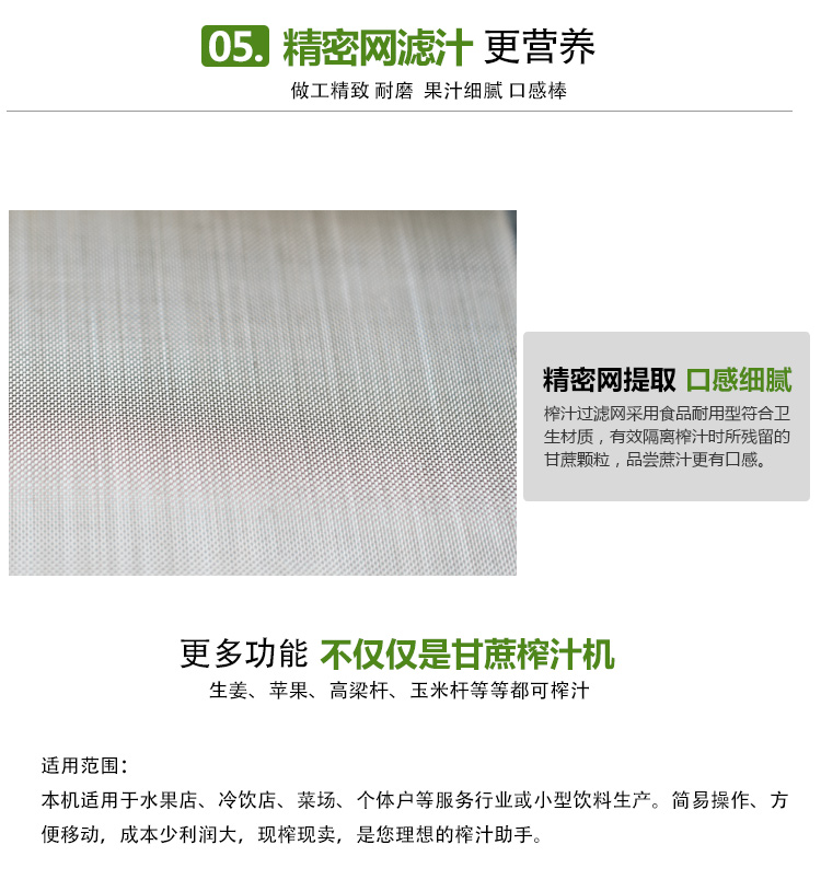 本產(chǎn)品適用于城鄉(xiāng)商場、菜場、商業(yè)街等人流量集中區(qū)。男女老少均可操作,成本低、利潤高,現(xiàn)榨現(xiàn)賣,是發(fā)家致富的好幫手�?杉庸じ收�、生姜、蘋果、高粱桿、玉米桿等進(jìn)行榨汁之用。