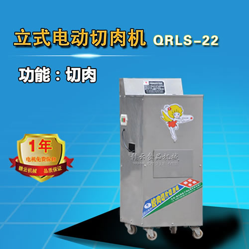 贛云牌電動(dòng)立式切肉機(jī)采用1.5kw電機(jī)作為動(dòng)力帶動(dòng)42片圓形等距離刀片雙向向內(nèi)切割小塊肉類,刀片直徑105mm,為使電機(jī)負(fù)荷減少,需將大塊肉切成小塊。立式切肉機(jī)主要用于切肉片、肉絲、肉丁,可切生肉、鹵肉等,常用于鹵菜加工,中小型食堂、飯店等。