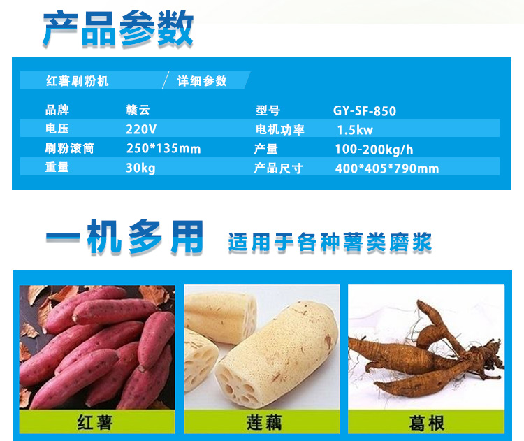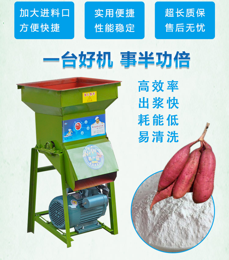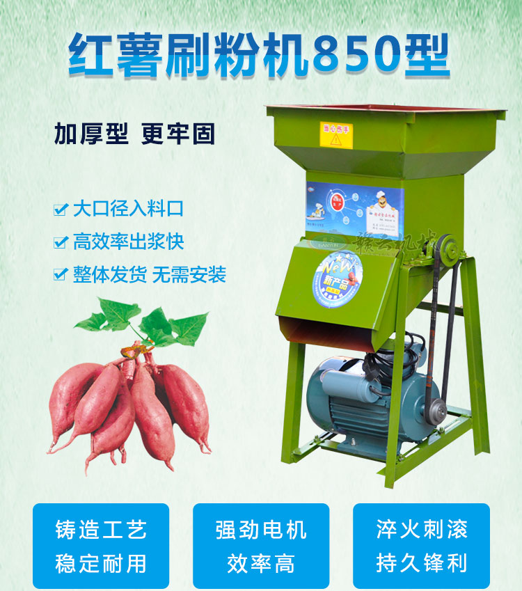 紅薯刷粉機(jī)適用于加工番薯/紅薯、木薯、馬鈴薯、蕉藕、芋頭及其它塊根作物的磨碎作業(yè),加工成粉。適用于山區(qū)、半山區(qū)的糧食加工廠及普通用戶�?膳溆�220V的1.5KW電機(jī)使用,也可配用柴油機(jī),目前價(jià)格配的是國(guó)標(biāo)銅線電機(jī)!