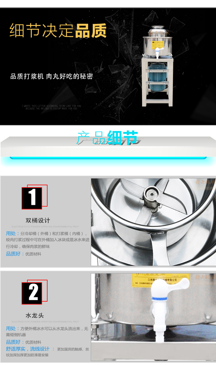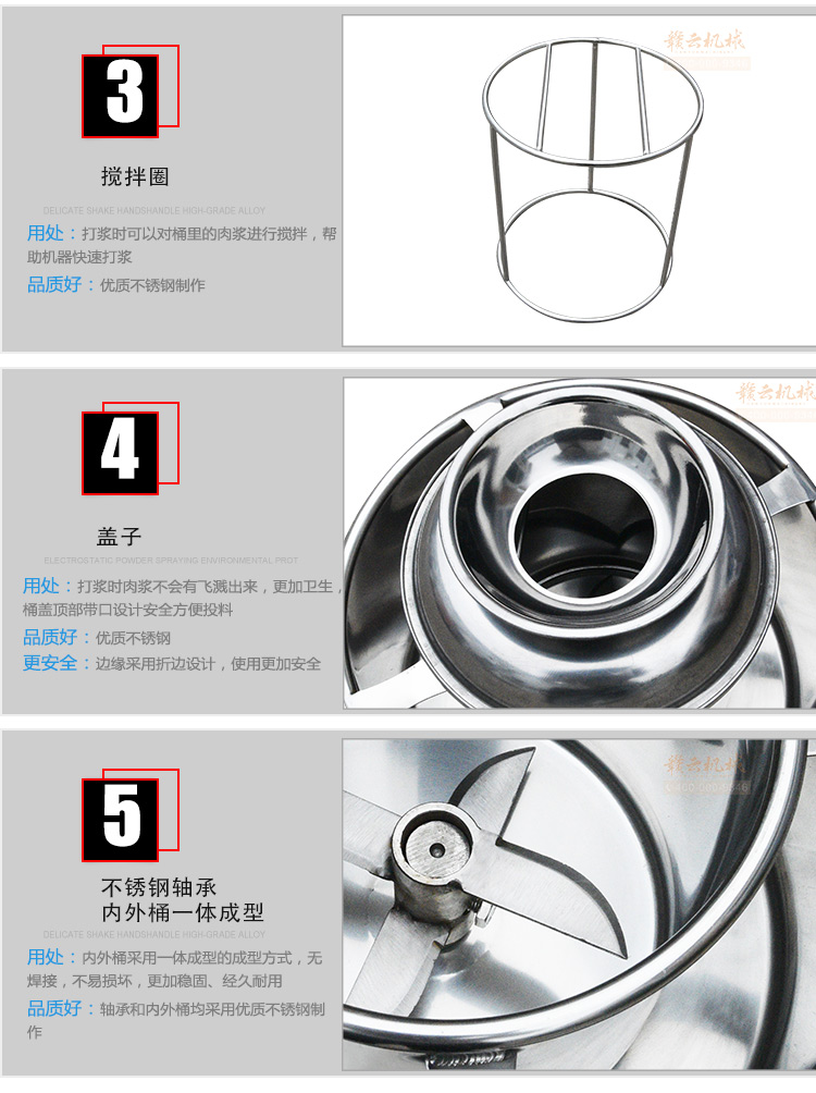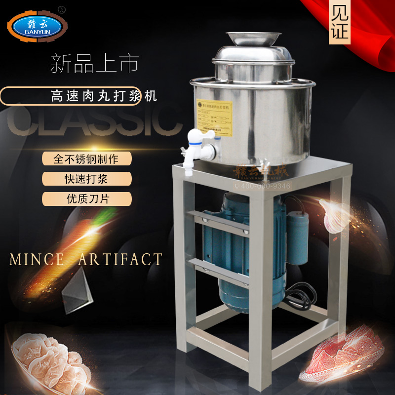 贛云牌新款全不銹鋼肉丸機,18型肉丸機采用全不銹鋼材質(zhì),在舊款全不銹鋼肉丸機的基礎(chǔ)上給支撐架加粗加厚,用不銹鋼蓋,打漿雙桶,刀柄刀片均采用不銹鋼材質(zhì)。打漿桶裝肉量1L,一次可打肉漿1-2斤左右,采用2800r/min高速電機,故稱之為高速肉丸機。