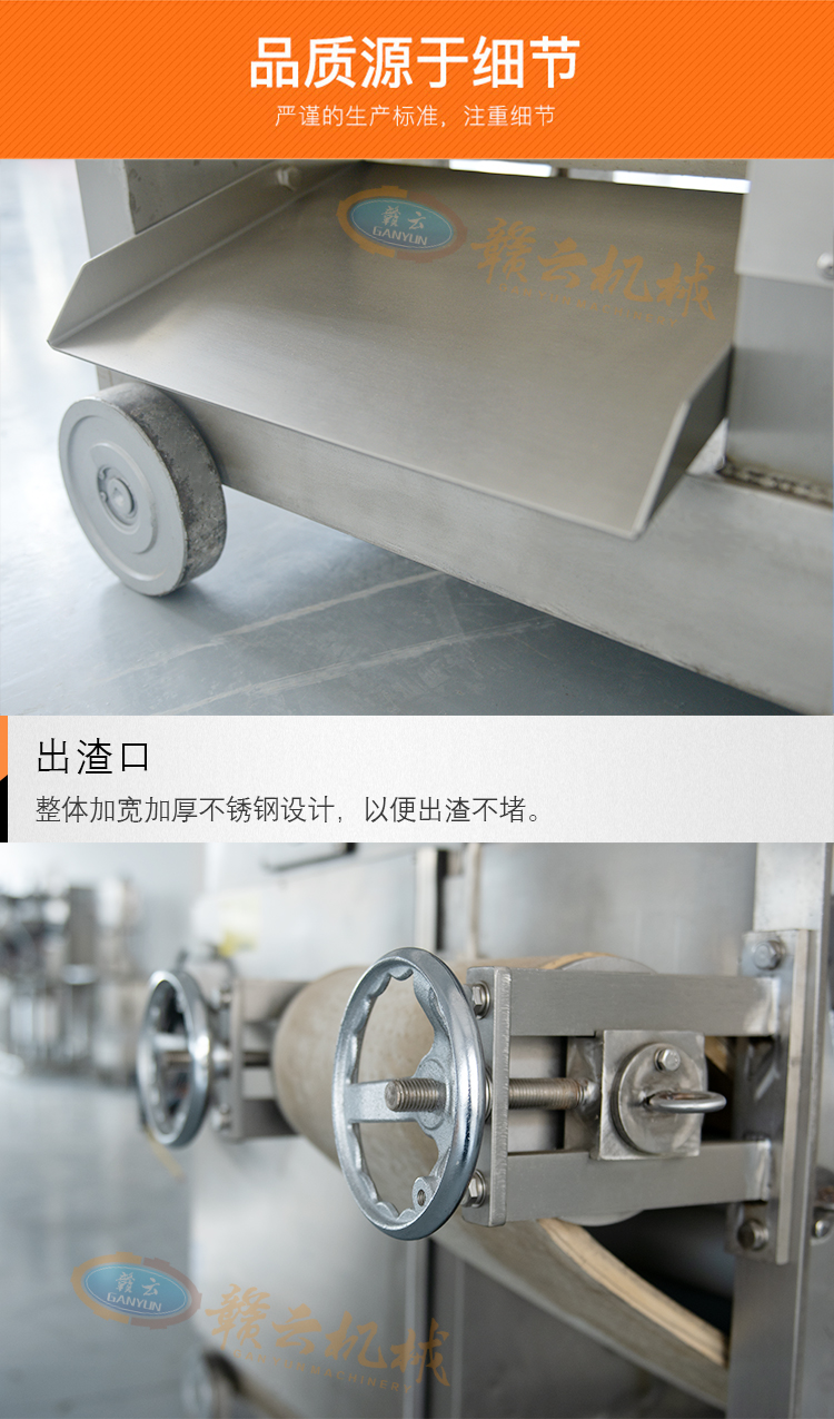 贛云牌350型魚肉采肉機(jī)采用全304不銹鋼,整體結(jié)構(gòu)設(shè)計(jì)高端大氣,牢固耐用,性能穩(wěn)定,各種調(diào)節(jié)裝置設(shè)計(jì)合理,人性化操作程度高,增加了潤(rùn)滑軸承的功能。以下是這款機(jī)器的結(jié)構(gòu)示意圖和實(shí)物拍攝細(xì)節(jié)圖等。