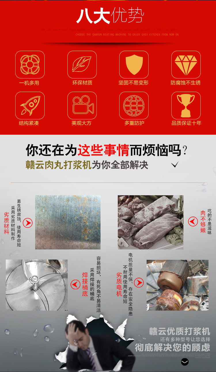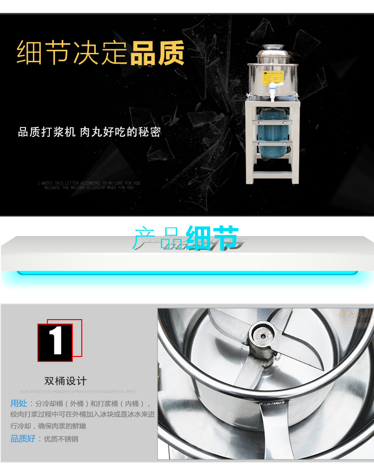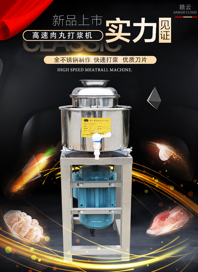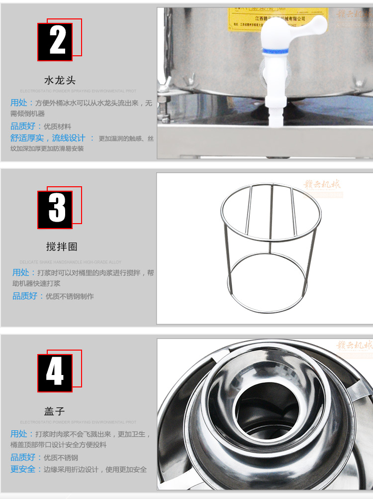 贛云牌肉丸打漿機(jī)采用全不銹鋼材質(zhì),默認(rèn)配用1.5kw國標(biāo)銅線贛云牌電動(dòng)機(jī),打漿刀片和刀架、攪拌圈、蓋子、支持架、打漿雙桶、軸承、螺絲均采用不銹鋼材質(zhì),是正真意義上全不銹鋼