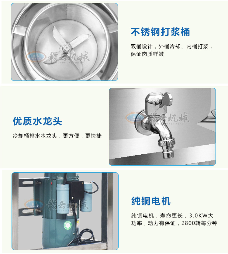 贛云牌全不銹鋼傳動(dòng)高速肉丸打漿機(jī),整機(jī)采用優(yōu)質(zhì)不銹鋼材質(zhì),拉伸桶底部弧形設(shè)計(jì),贛云新款肉丸打漿機(jī)標(biāo)志性設(shè)計(jì)。無(wú)縫焊接技術(shù)展現(xiàn)高檔品質(zhì)。一次性可打肉漿5-6斤,2分鐘左右即可完成肉漿的制作。所打肉漿細(xì)膩,是肉丸專用打漿設(shè)備之一。