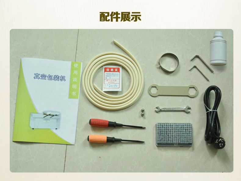 2、將所需包裝的物品裝入包裝袋【塑料復(fù)合袋或鋁箔復(fù)合袋】內(nèi),放入真空室內(nèi),提起壓條,均勻的把袋口置于熱封架上排好,然后放下壓條。