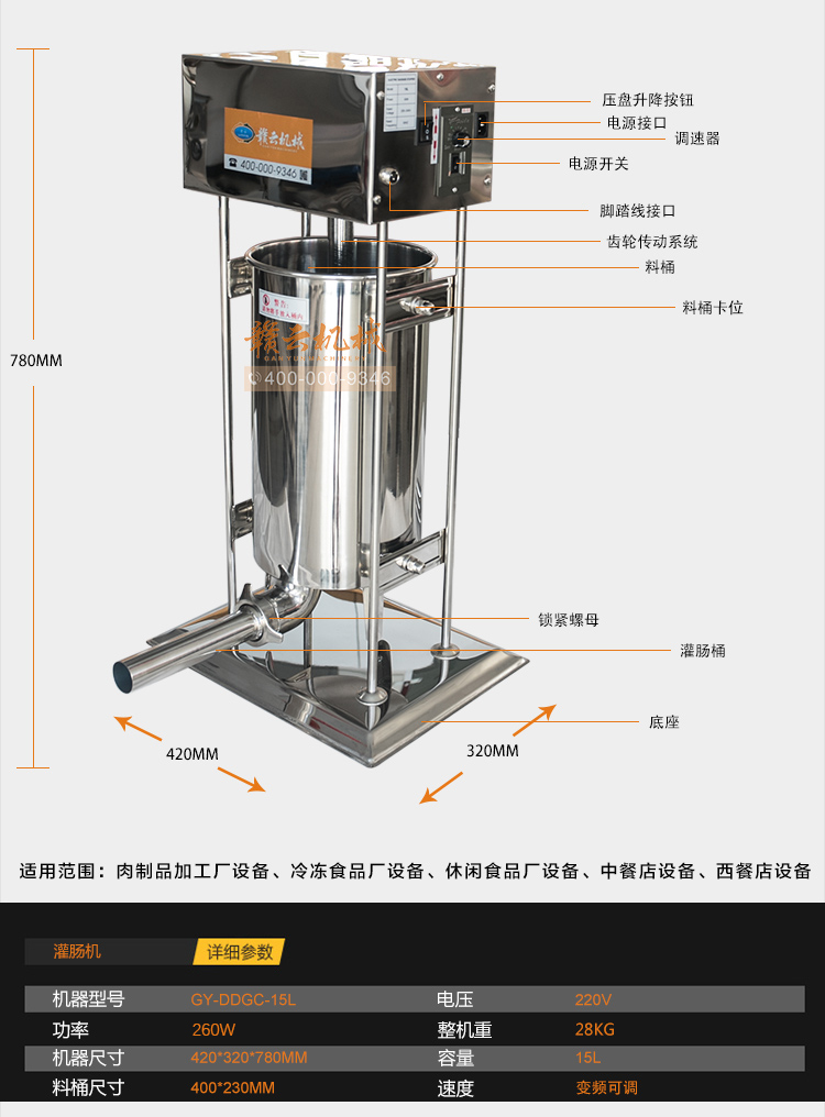 主頁-> 肉制品前處理->專用灌腸設(shè)備->電動(dòng)灌腸機(jī)15L