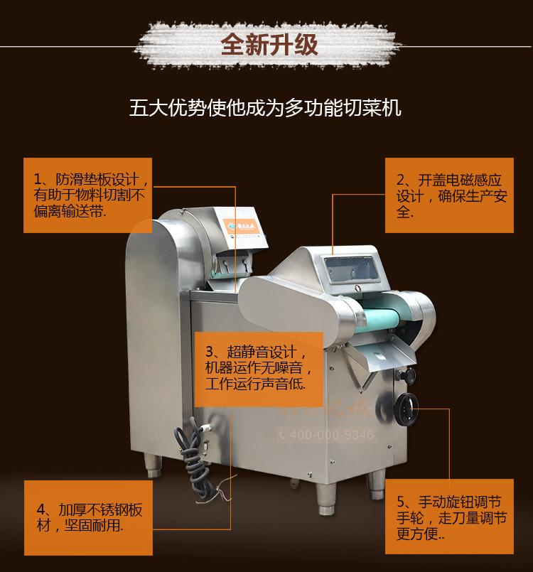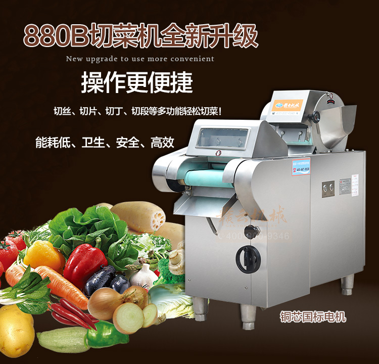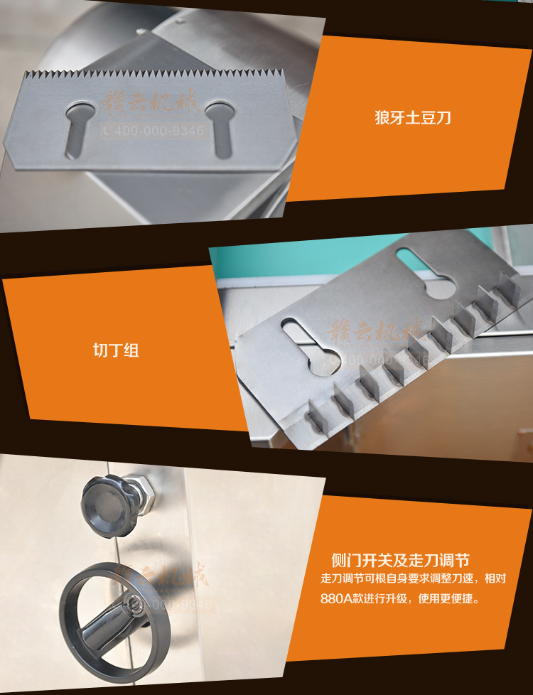贛云880B型切菜機(jī),采用標(biāo)準(zhǔn)不銹鋼板材加工設(shè)計(jì),做工精細(xì),外形美觀大方,利用齒輪偏心設(shè)計(jì)手動(dòng)旋鈕便攜可調(diào)走刀量,在原880A型切菜機(jī)基礎(chǔ)上改良設(shè)計(jì)而成,解決多功能切菜機(jī)手動(dòng)走刀量調(diào)節(jié)問(wèn)題,是食堂,企業(yè)單位、酒店廚房多樣切菜設(shè)備。