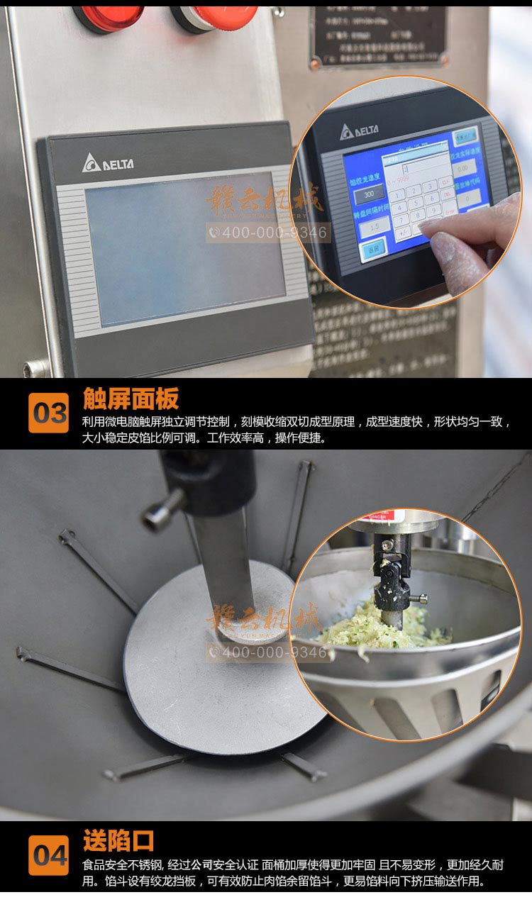 新型智能包子機(jī)利用微電腦觸屏獨(dú)立調(diào)節(jié)控制,刻模收縮雙切成型原理,成型速度快,形狀均勻一致,大小穩(wěn)定、皮餡比例可調(diào)。與傳統(tǒng)包子機(jī)和早期系列型號(hào)相比,無論工作效率、智能控制、還是環(huán)保衛(wèi)生方面都有很大的提高。適用于面食加工廠、企事業(yè)單位食堂、包子店等。