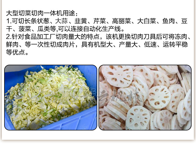 大型切菜切肉一體機(jī)用途可切長(zhǎng)條狀蔥、大蒜、韭黃、芹菜、高麗菜、大白菜、魚肉、豆干、菠菜、瓜類等、可以連接自動(dòng)化生產(chǎn)線。針對(duì)食品加工廠切肉量大的特點(diǎn),該機(jī)更換切肉刀具后可將凍肉、鮮肉、等一次性切成肉片,具有機(jī)型大、產(chǎn)量大、低速