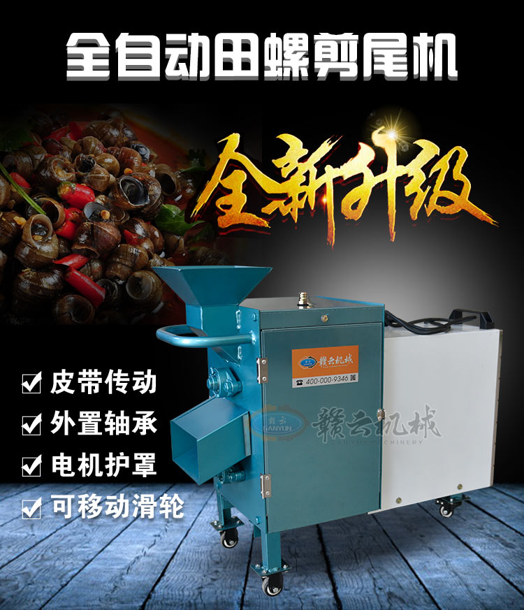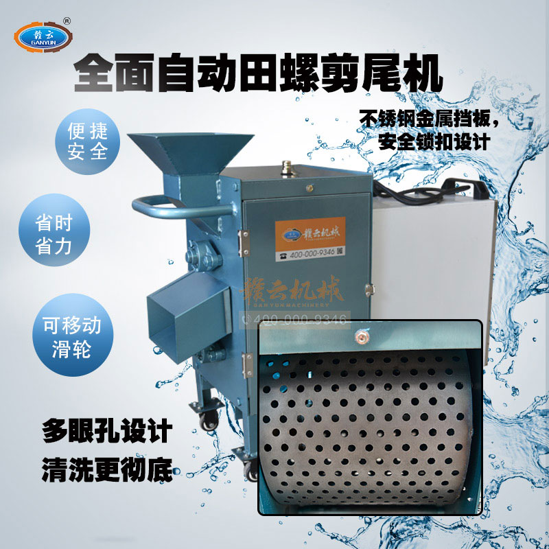 田螺剪尾機(jī)原理適用于菜場(chǎng)、飯店加工螺螄,減少人力。只需將螺螄倒入進(jìn)料口,啟動(dòng)電源運(yùn)轉(zhuǎn)5分鐘,剪完后往進(jìn)口沖1-2次水,停機(jī)拉開(kāi)閘門即可