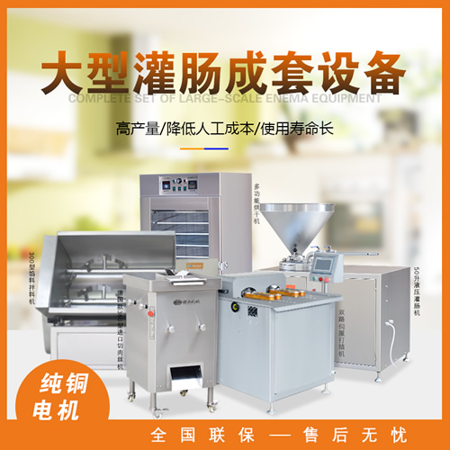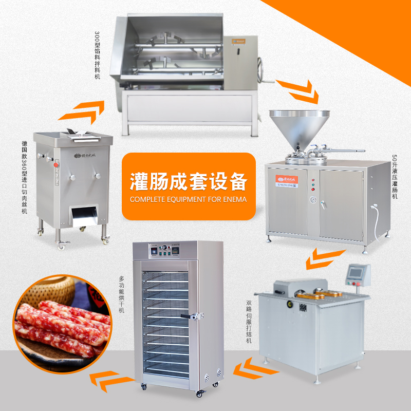 針對本地腸、臘腸、香腸、廣式香腸等生產(chǎn)加工設(shè)備,整套包含切肉機(jī)、拌餡機(jī)、灌腸機(jī)、扎線機(jī)、烘干機(jī)。