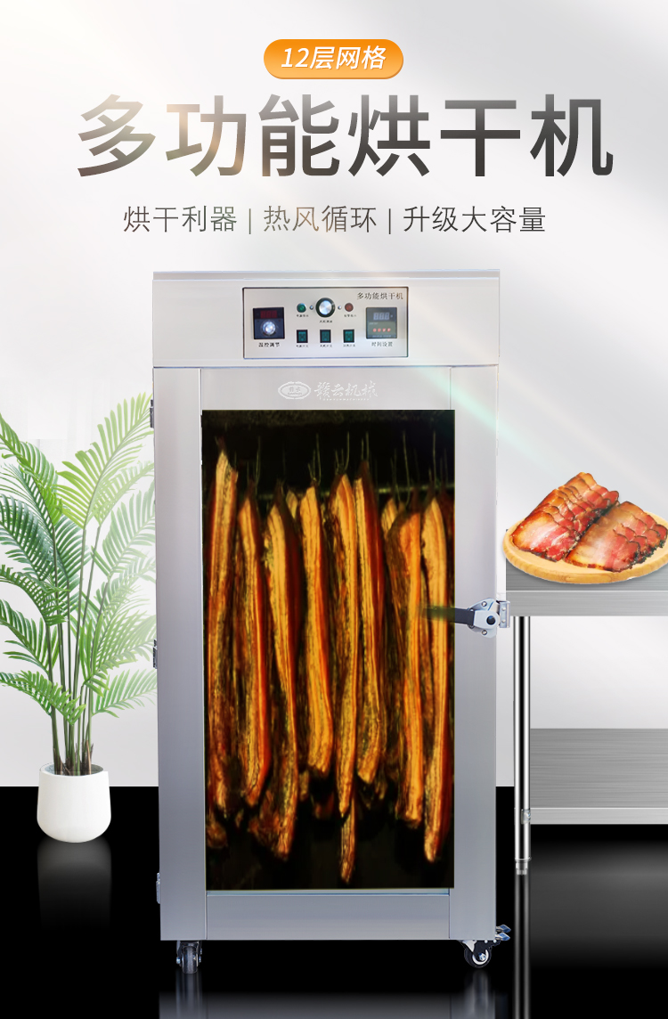 商用多功能烘干機,你知道嗎?有這樣一款多功能烘干機,它可以針對肉制品:臘腸、臘肉、板鴨等,也可以針對芒果烘干、干果烘干、蔬菜烘干等多種不同食材烘干,使用不銹鋼材質,使用大風機散熱讓機器360度立體烘干。