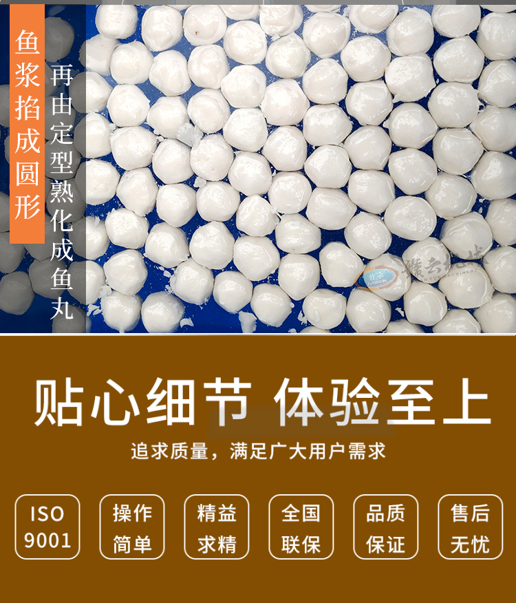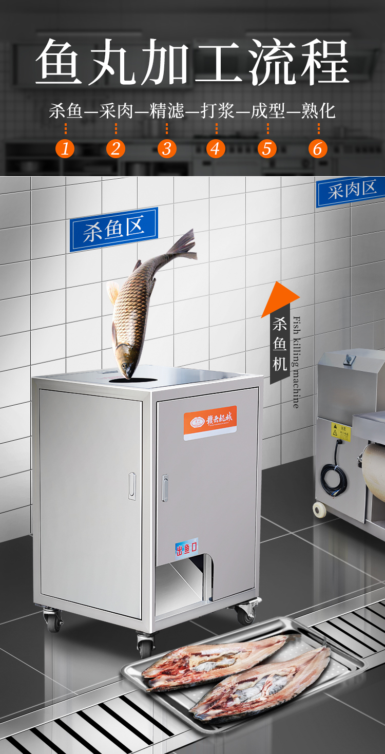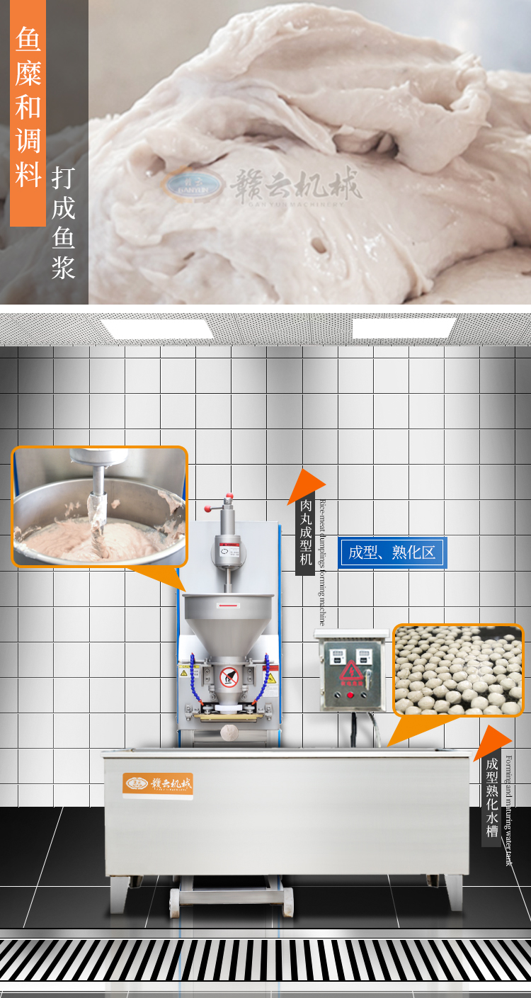 本套魚丸設(shè)備包含:殺魚機(jī)、魚肉采肉機(jī)、魚肉精濾機(jī)、三速制冷打漿機(jī)、搖擺肉丸機(jī)、雙溫控加熱水槽。操作步驟是先將活魚通過殺魚機(jī),先開肚去魚鱗,然后將殺好的魚通過分切后,進(jìn)入魚肉采肉機(jī)進(jìn)行魚肉魚刺分離。若需要提升魚丸的品質(zhì),建議將采集好的魚肉, 通過魚糜精濾機(jī)將魚肉中的魚筋、魚血、魚皮等在次進(jìn)行過濾出來,經(jīng)過這一步驟得到的魚肉品質(zhì)就很高。將已經(jīng)精濾過的魚肉通過三速制冷打漿機(jī)進(jìn)行打漿和配料。最后將打好的魚漿通過搖擺肉丸機(jī)進(jìn)行成型和定型熟化。