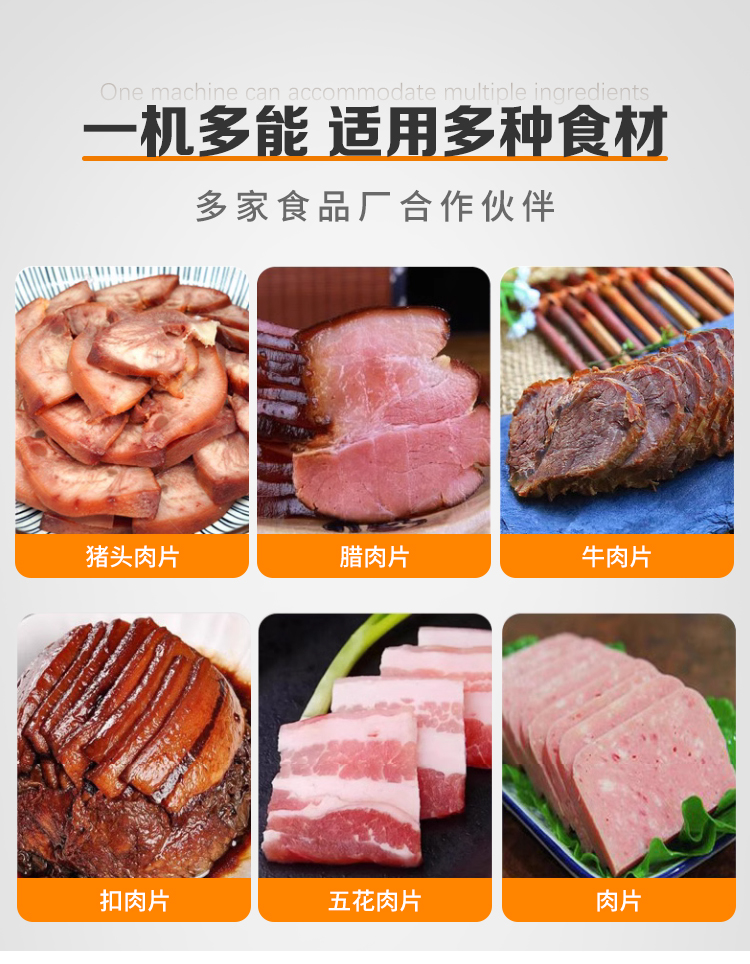 用于豬頭肉、臘肉、牛肉、扣肉、五花肉、火腿等快速切片切段,適應多種食材。