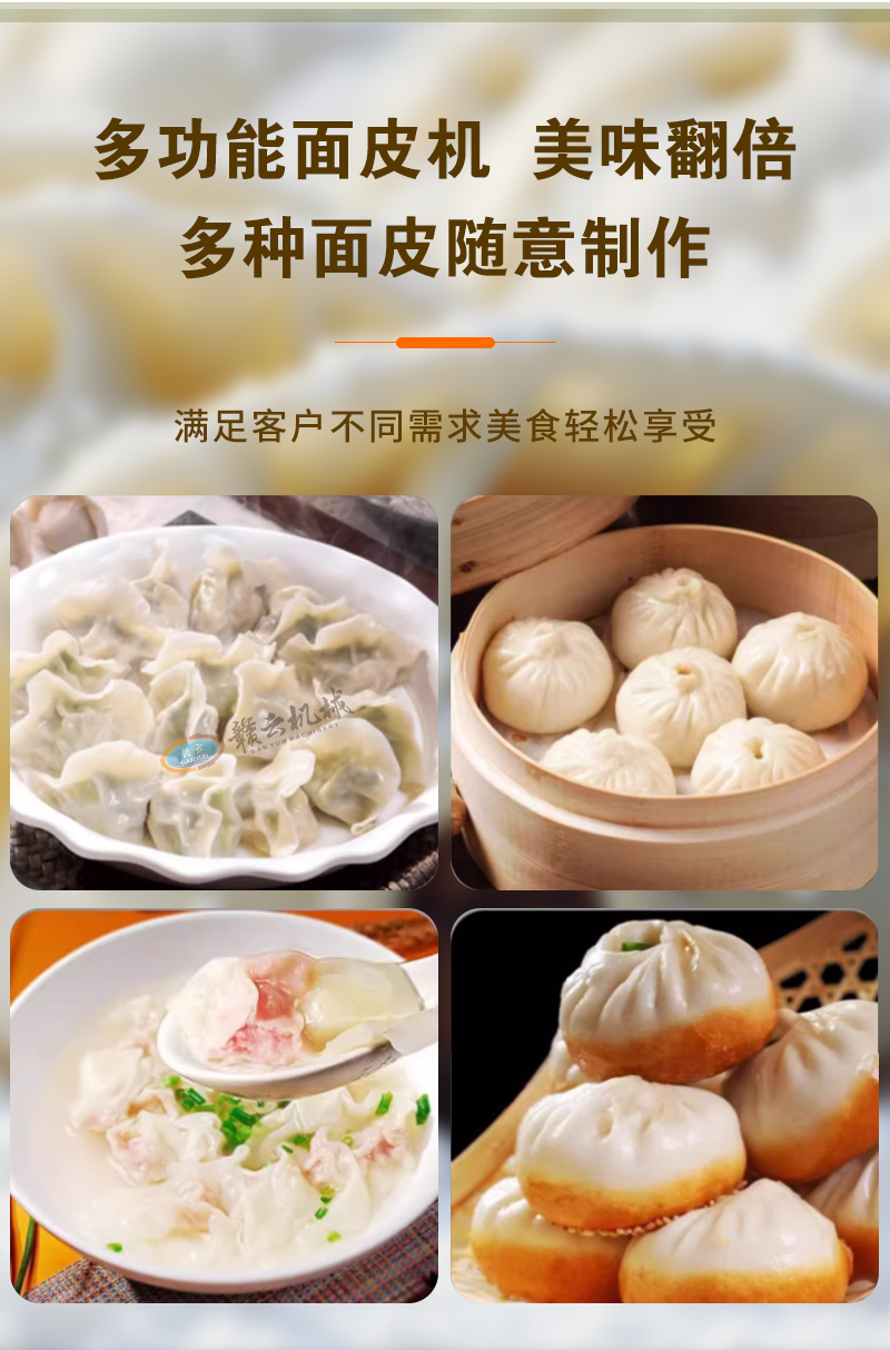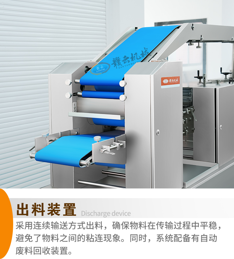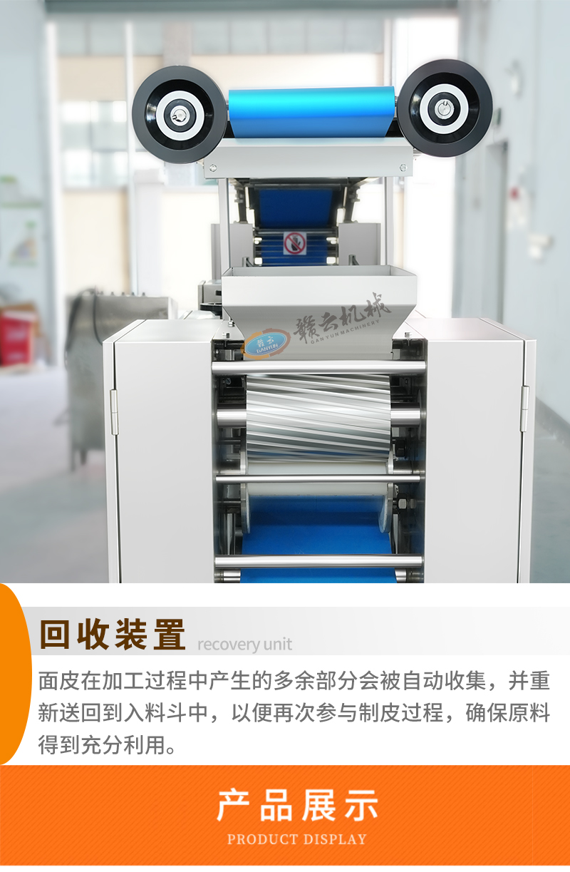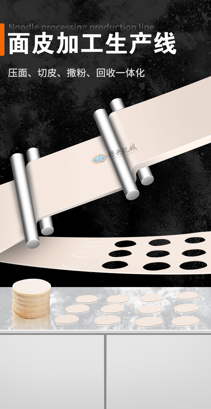 用于全自動(dòng)面皮生產(chǎn),可加工生產(chǎn)餃子皮、餛飩皮、燒麥皮、包子皮等。