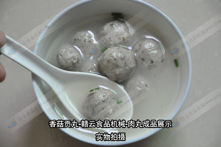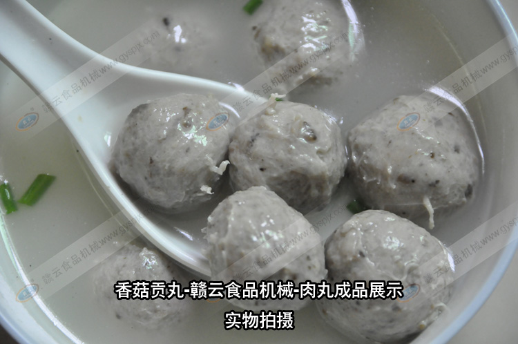 贛云食品機械肉丸成套設(shè)備的結(jié)晶,香菇貢丸,合作客戶獨家配方,用贛云牌肉丸設(shè)備制作的香菇貢丸,味美,有嚼勁,香菇原味,保證您吃了還想吃。香菇貢丸所需設(shè)備:自動絞肉機一臺,高速打漿機一臺,慢速打漿機一臺,食物切碎機一臺,貢丸機一臺,自動煮丸水槽一臺即可現(xiàn)做現(xiàn)賣,也可接單定做。相關(guān)設(shè)備的工作內(nèi)容:自動絞肉機碎肉,高速打漿機將肉�?焖俅虺扇鉂{,慢速打漿機將肉漿調(diào)味,食物切碎機將香菇切成細小顆粒,放入慢速漿機中和肉漿一起調(diào)勻入味,貢丸機將肉漿成型貢丸,自動煮丸水槽將成型后的肉丸初步定型。批量的香菇貢丸就是這樣制作而成。