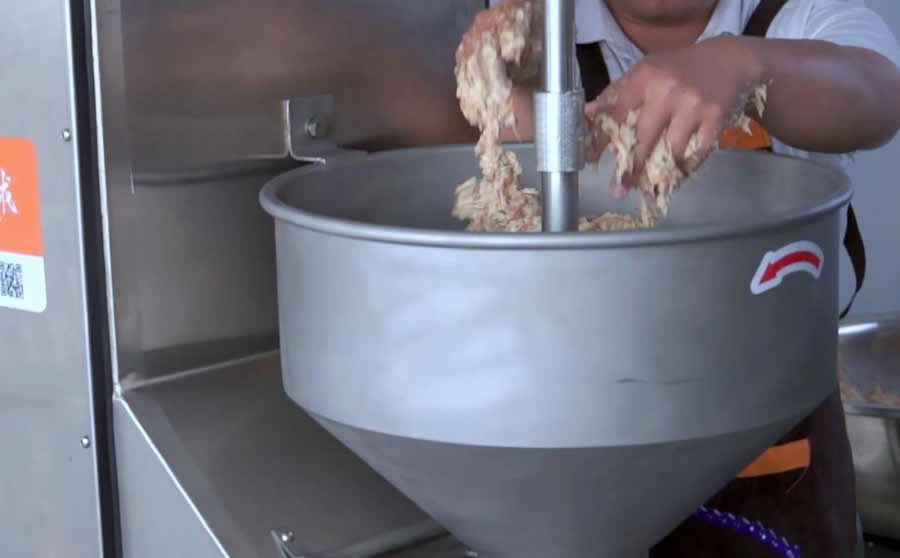 將通過絞切處理后的食材根據(jù)工藝比例倒入這臺自動化不銹鋼拌餡機(jī)。拌餡機(jī)可對粒狀、粉狀、泥狀物料根據(jù)需求設(shè)定攪拌時間,機(jī)器擁有5槳交錯攪拌,操作過程中可自動切換正反轉(zhuǎn),這臺機(jī)器單次一桶可加工100L物料。