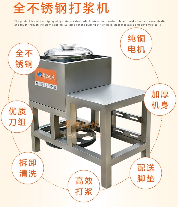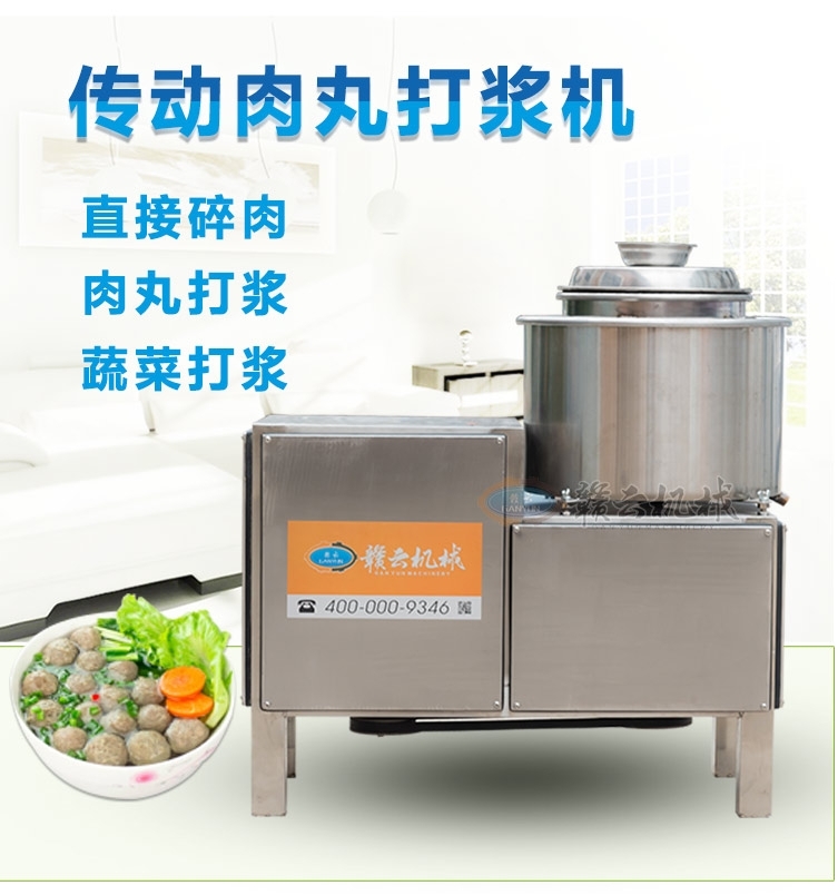 這臺慢速打漿機通過大皮帶輪減速帶動打漿機刀片打漿,這樣通過慢速拍打,可以使拍打過程中能對肉類組織細胞拉絲重組,加大吸收水分,提高肉類的嫩化程度,讓打出來的肉漿制成丸子后更軟彈有嚼勁。適合魚丸、牛肉丸和貢丸的制漿之用。