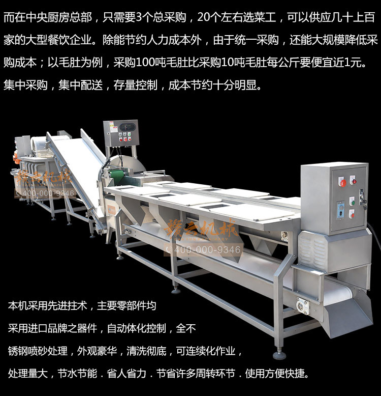 本套設(shè)備可用于中央廚房多元化分選、切割、清洗、過濾之用,主要適用于葉菜類凈菜加工切配,也適用于球根類蔬菜如白蘿卜、胡蘿卜等切片清洗,本套設(shè)備配有臭氧發(fā)生器,可用于清楚農(nóng)藥殘留,清洗模式采用渦流沖壓式漩渦清洗,并帶有三層過濾裝置,渦流水槽內(nèi)頂層排渣處理裝置,高頻振動篩雙層過濾。價格說明:配一臺提升機119980元/套,配兩臺提升機129860元/套。定制設(shè)備價格請與客服聯(lián)系