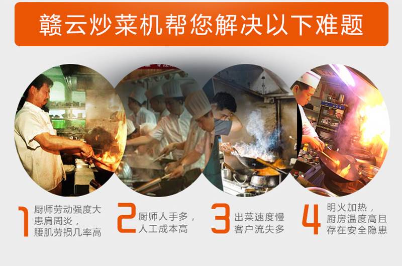 贛云炒菜機(jī),全自動(dòng)翻炒,不必人工翻攪,在炒菜期間不會(huì)有飛濺,給人輕松,安全的感覺。減輕工作人員勞動(dòng)強(qiáng)度,減少傷病同時(shí),提高工作效率。