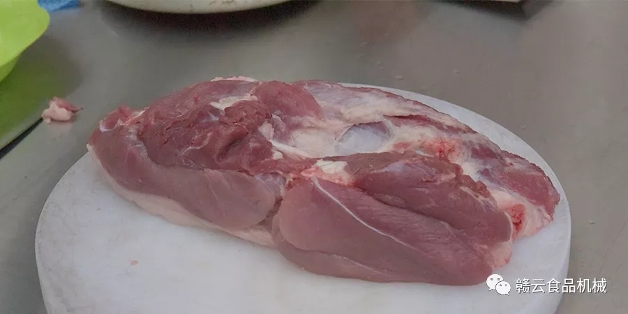 2、切塊:將顧客選用的灌腸原料肉進(jìn)行切塊,切3-5cm的小塊,便于切絲時(shí)使用。