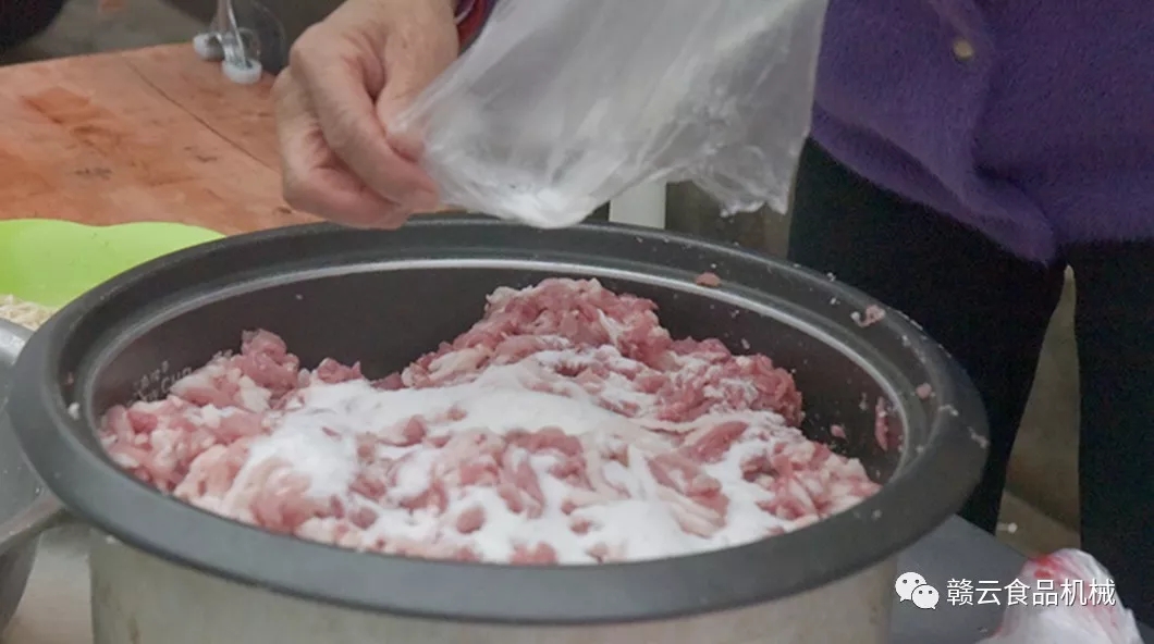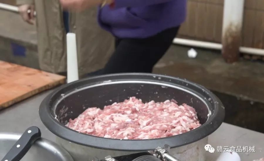 特別提示:拌制時(shí)要控制攪拌質(zhì)量,加大原料肉和調(diào)料的混合攪拌,確保調(diào)料和原料肉拌制均勻,避免灌腸前原料肉上仍有調(diào)料干結(jié)小結(jié)塊。