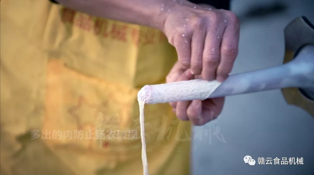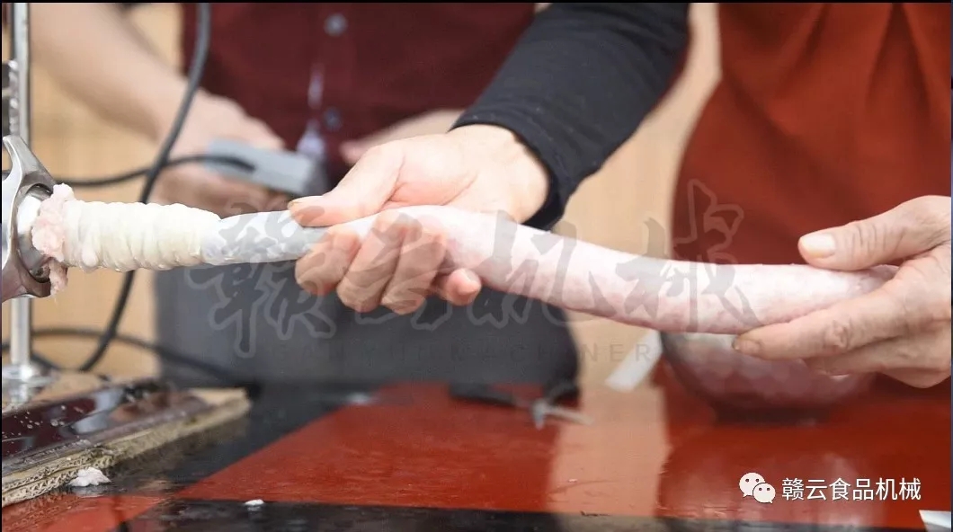 ③當(dāng)出現(xiàn)腸衣破損時(shí),要將其從破損處切掉扎口,將溢出的肉放入機(jī)器重新灌制;