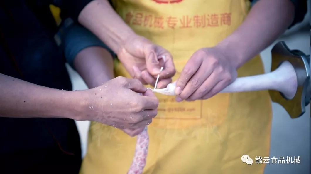 10、灌制:2人通力配合,一人負(fù)責(zé)勻速向絞肉機(jī)內(nèi)放置原料肉,另一人一只手緊握灌腸喇叭口的出肉口,另一手緊握灌制好的香腸,防止扭曲破裂。