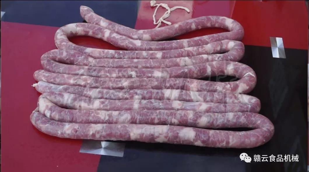 ①在灌制過程中,一定要控制下肉速度,勻速進(jìn)行,保證絞肉機(jī)出肉均勻且緊密,香腸飽滿,杜絕香腸晾干后出現(xiàn)空皮現(xiàn)象;